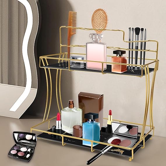 As an expert in the beauty industry, I highly recommend our 2-Tier Rectangular Golden Vanity Stand. Its sleek design and two tiers provide ample space for all your beauty essentials. Crafted with a golden finish, it adds a touch of elegance to any vanity. Up your organization game with this must-have vanity stand.