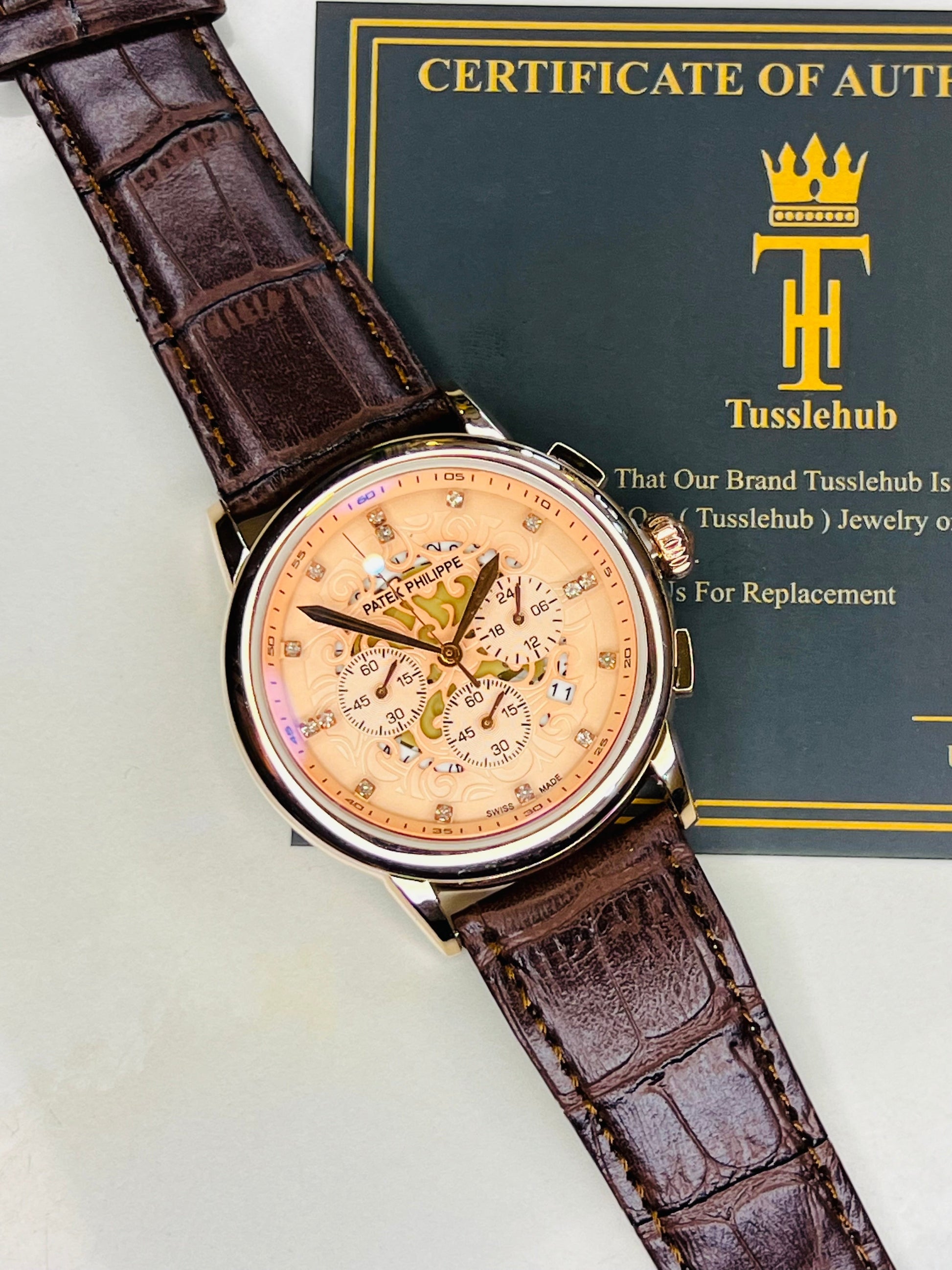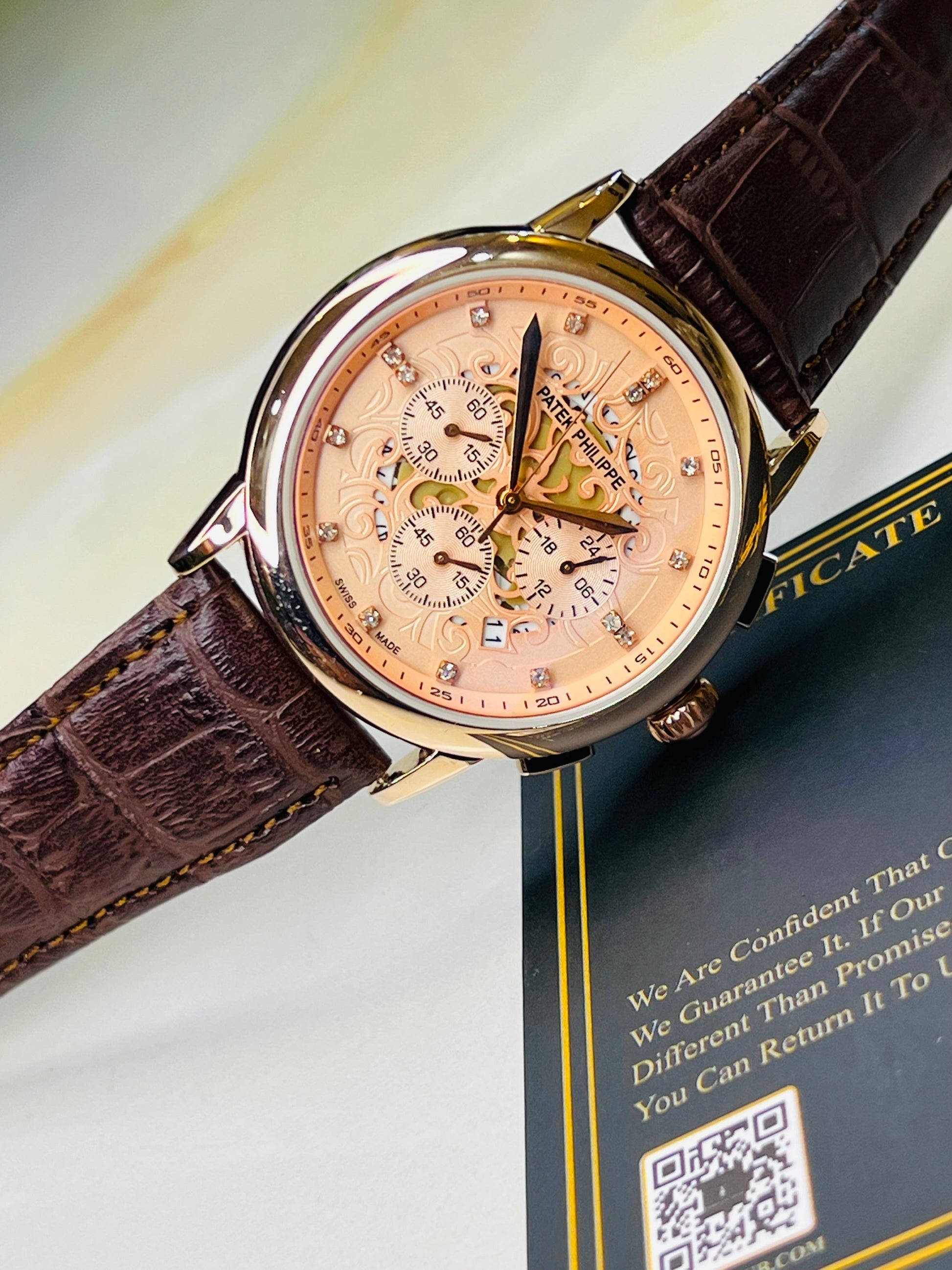 Brown Copper Round Rose Gold Skeleton Chronograph Dial PP Watch