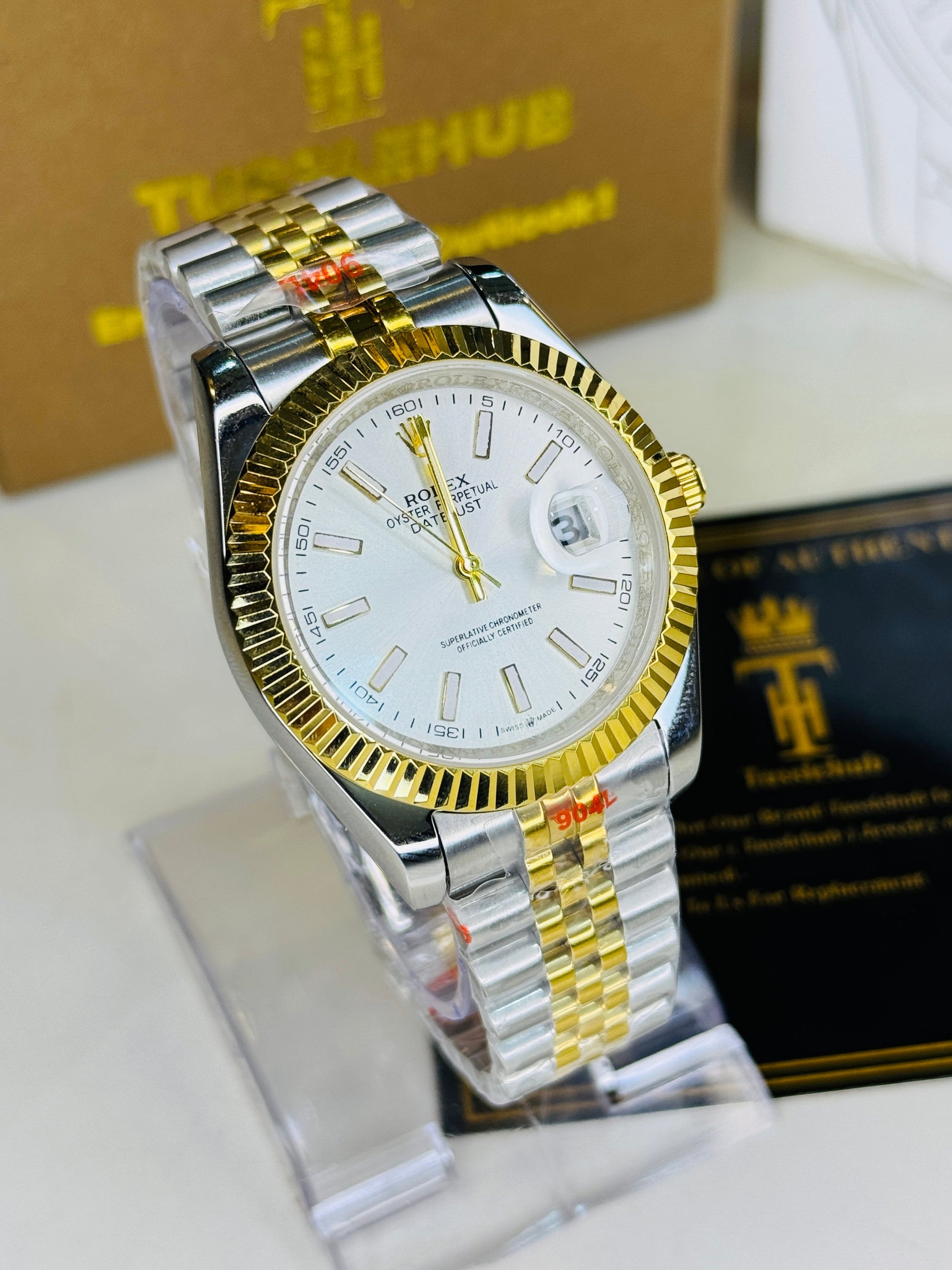 Jubilee Date Just Two Tone Vertical Fluted White Dial Quartz Watch