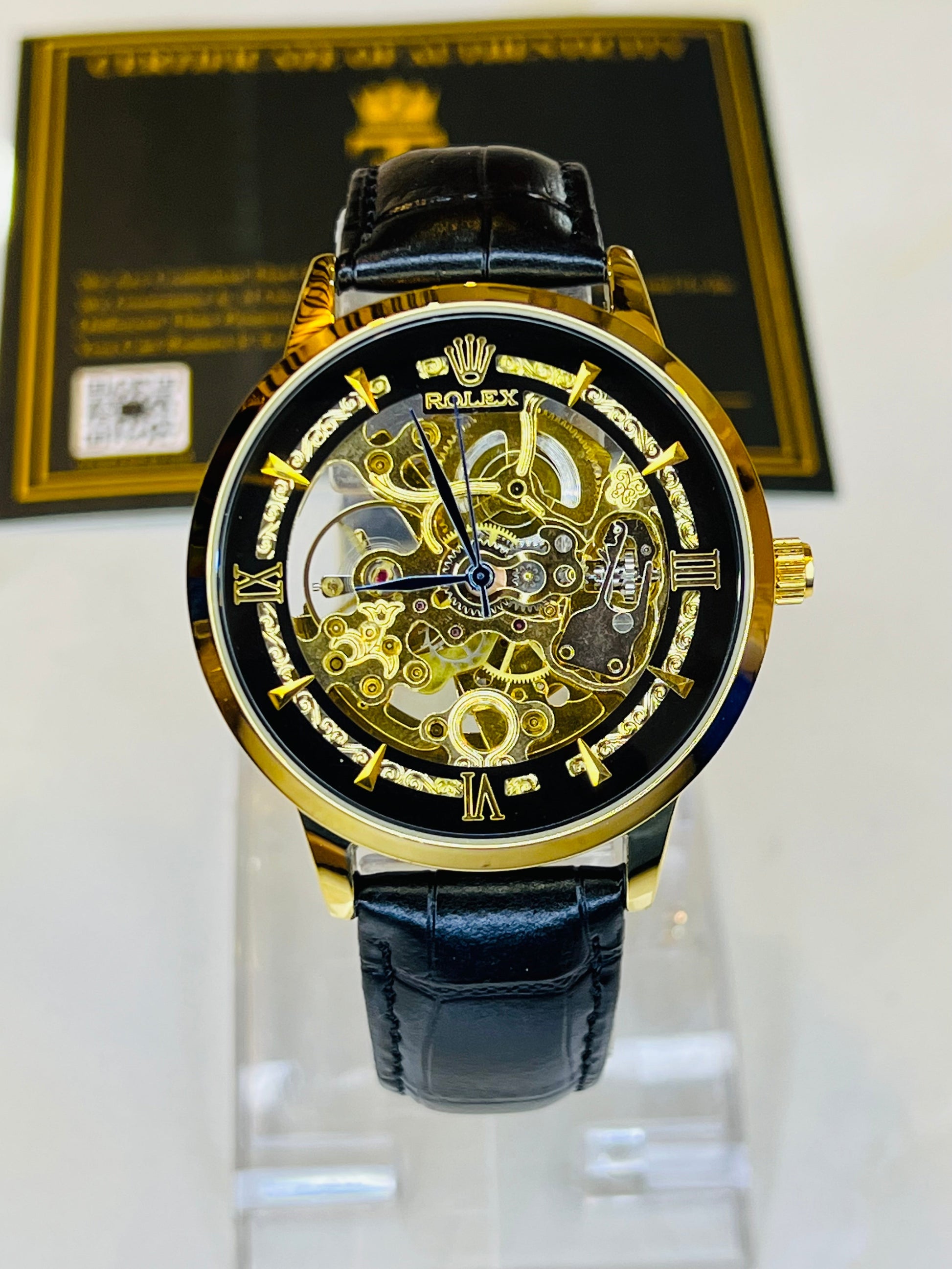 Leather Rol*x Black Gold Automatic Skeleton Watch