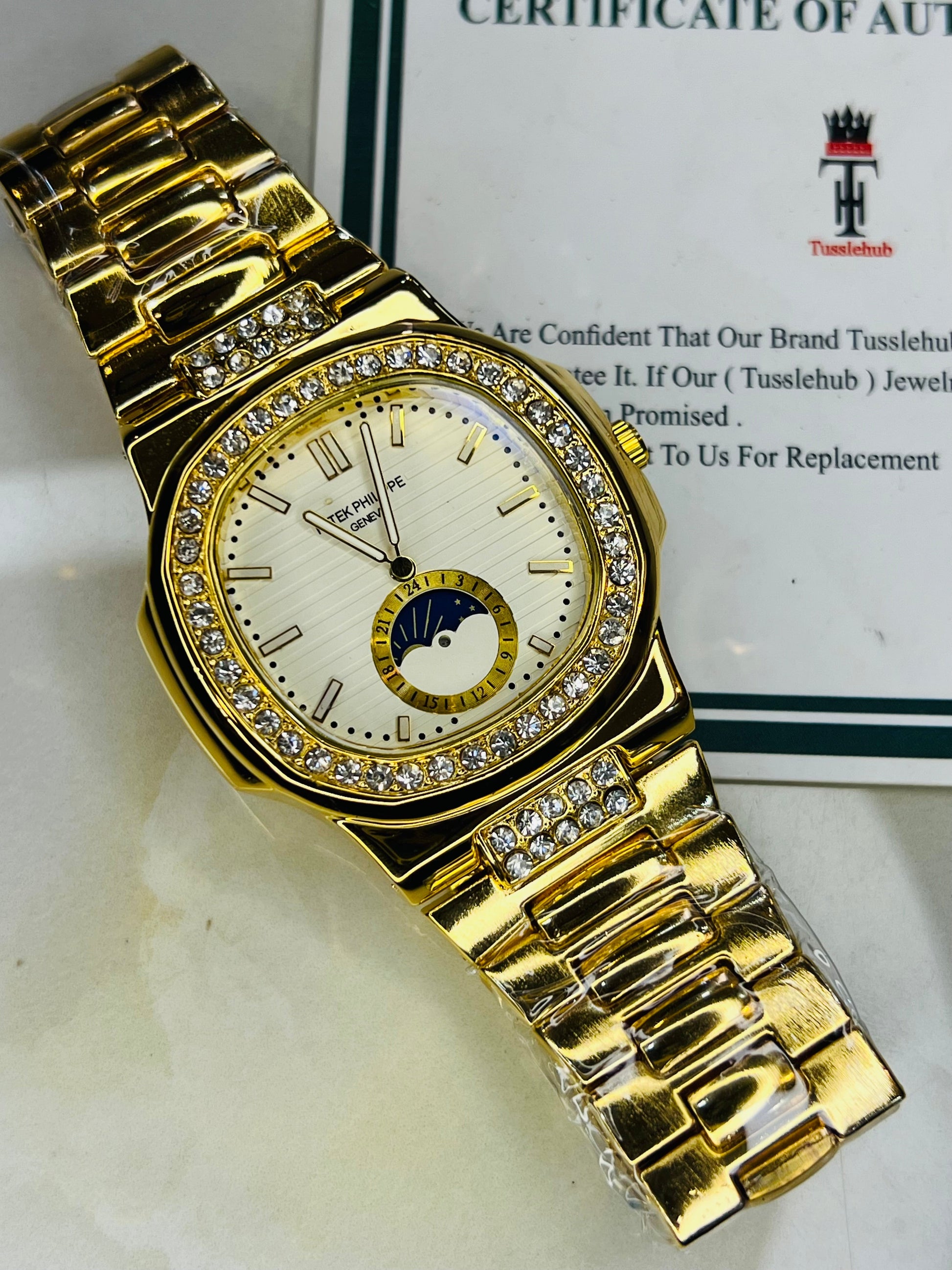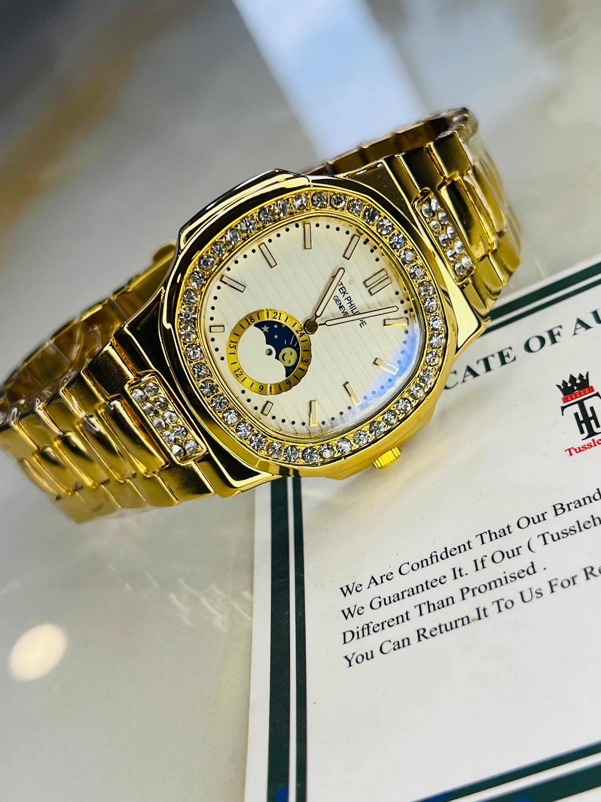 Gold White Chain Strapped Down Second Zircon Dial Watch