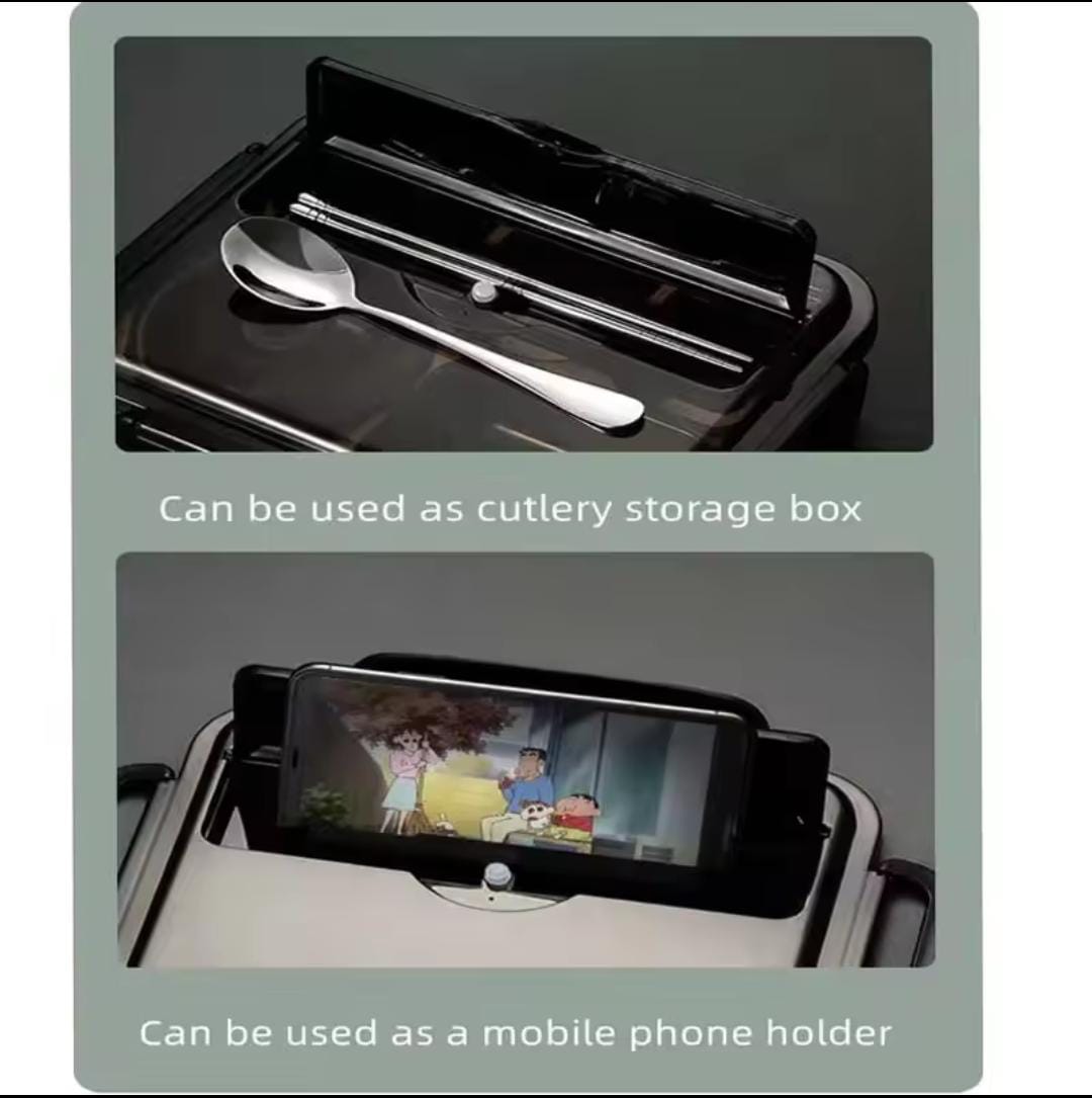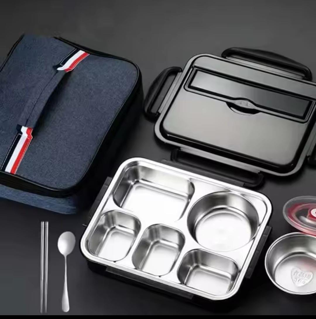 Leak-Resistant Stainless Steel lunch box with 5 compartments With spoon and sticks