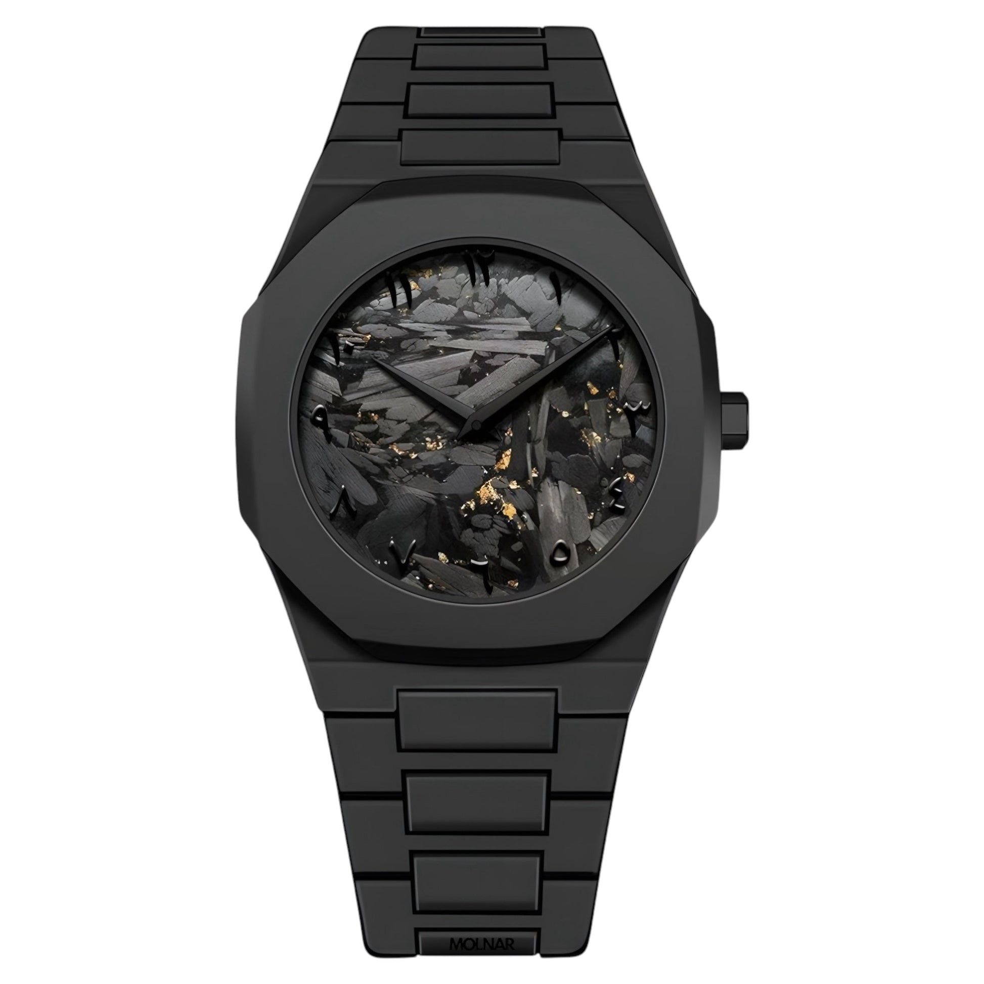 Sleek, powerful, and unmistakably refined the Molnar Nuit is crafted for those who command presence without saying a word. Its all-black silhouette is elevated by a forged carbon dial, delivering both strength and lightweight performance. Subtle gold accents add a touch of understated luxury, making this timepiece a perfect balance between modern engineering and timeless elegance.