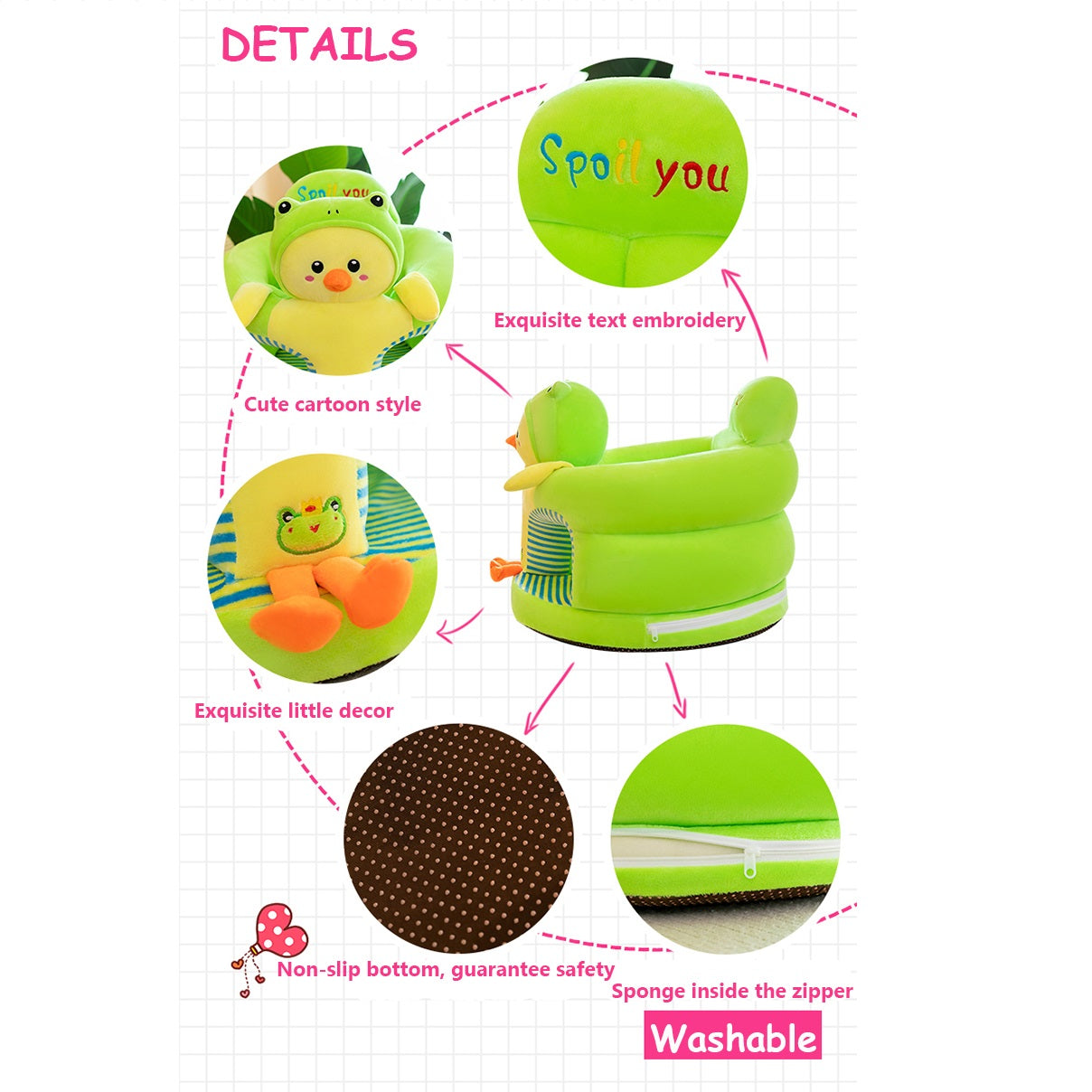 The Spoil You Floor Seat Duck is also great for providing extra support and comfort while sitting or sleeping, and can be easily transported and stored thanks to its compact and lightweight design. The adjustable safety straps ensure that babies are secure at all times, giving parents peace of mind.